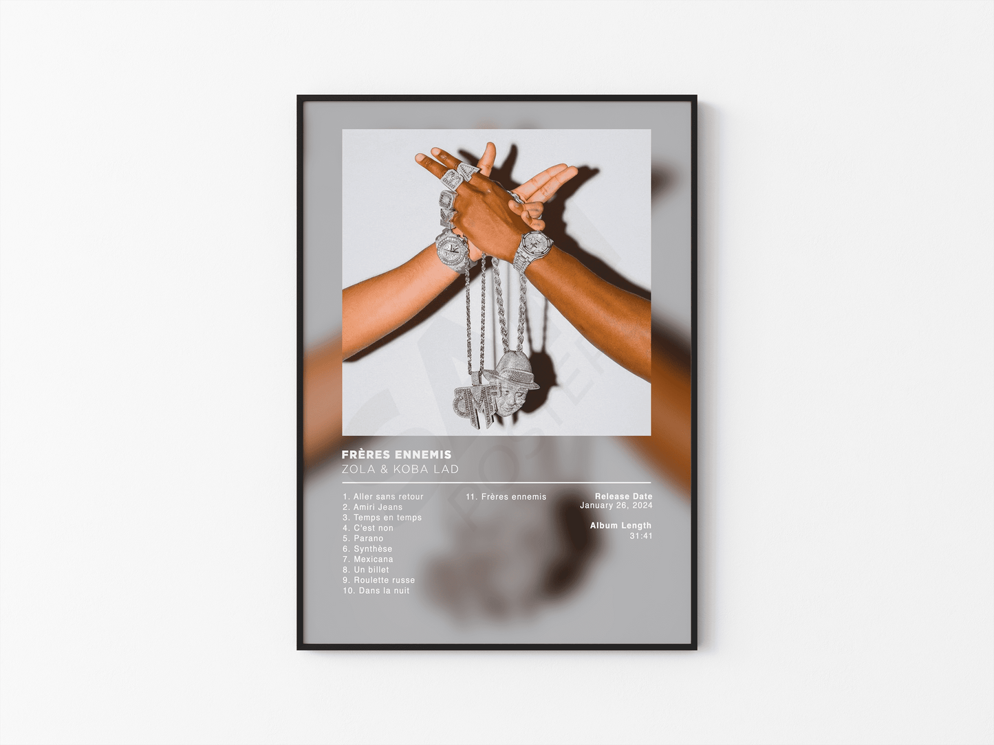 Explorez l'univers Frères Ennemis de Zola & Koba LaD avec nos affiches exclusives. Transformez votre espace pour donner vie à vos murs avec des posters uniques capturant l'esthétique de cet album.